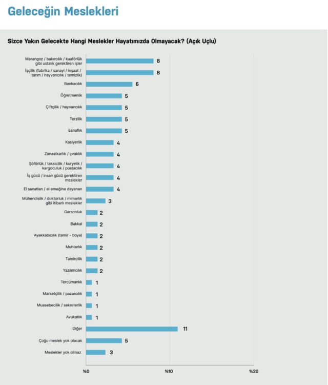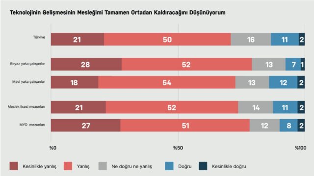 Raporun 34. sayfasında yer alan bir başka çarpıcı veri: Her beş kişiden biri, teknolojik gelişmeler nedeniyle işini kaybetme riski taşıdığını düşünüyor. Yani geleceğin meslekleri kadar, geleceksizleşen meslekler de toplumun zihinsel ajandasına girmiş durumda. Kuaförlük, marangozluk, bankacılık, hatta öğretmenlik gibi geleneksel mesleklerin bile “tehlikede” görülmesi, yapay zekâ ve otomasyonun etkisinin artık soyut değil, somut bir kaygı olarak yaşandığını gösteriyor.