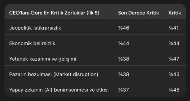 CEO’ların bu denli yüksek bir adaptasyon ihtiyacı hissetmesinin temelinde, karşılaştıkları çok yönlü riskler yatıyor. Liderler için en acil ve “son derece kritik” tehdit %46 ile jeopolitik istikrarsızlık olarak öne çıkıyor. Ekonomik belirsizlik, yetenek yönetimi ve yapay zekanın etkisi de listenin başında yer alıyor.